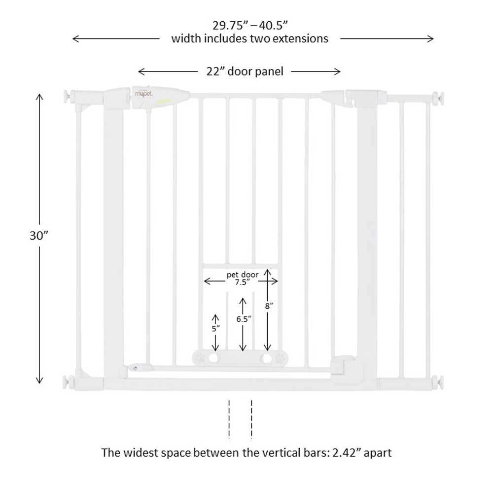 "The patented EasyPass pet door makes this gate truly unique. The small door retracts up into the gate tubing at three height intervals (5”, 6.5” & 8”) so it can be left open at the desired height, depending on your pet’s size. This pet door allows smaller dogs and cats the freedom to come and go while larger pets stay contained. When it’s time to close the cat door, simply use the designated slots found on the door and squeeze to gently bring the door down – no annoying dog door that’s been left open to trip over! This dog gate has an extra wide 22” door for the entire family to walk through with ease. To control the direction that the gate swings, a swing control lever allows you to decide - swing in one direction or allow the gate to swing in both directions. There’s also a glow-in-the-dark feature which illuminates the large easy-grip handle, making it easy for you to see and open the gate at night. This dog gate comes in a crisp white finish that will blend seamlessly with any home decor, while its heavy-duty steel construction is chew-proof and built to last. This gate fits openings from 29.75 - 40.5 inches wide and comes with two extensions. Quickly and easily install this pressure-mounted gate with the twist of the tension mounts. Safety and containment all wrapped up in one gate – how simple. Please note: When you unpack this gate you will notice that it is not square. This is normal and the gate is not damaged. It is manufactured at a pre-set angle so when it is installed properly in the opening, it will maintain the correct amount of tension and prevent it from being pushed out of the opening under normal use. Please read and follow the instruction manual carefully.